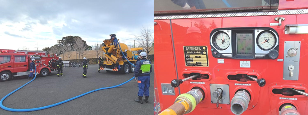 この訓練では、ミキサー車への給水から簡易水槽への放水、そして、簡易水槽からホースを使っての放水訓練を行いました。